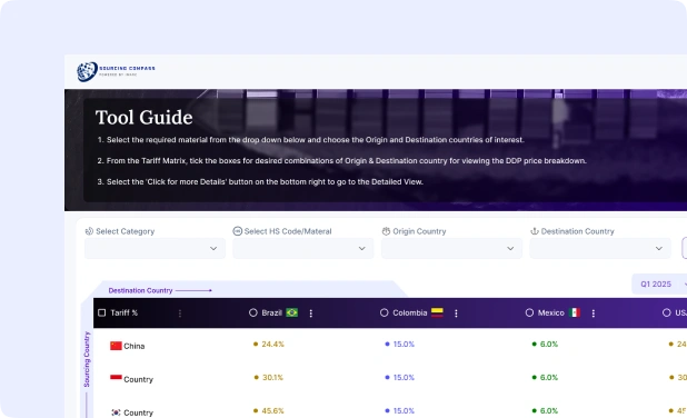 Sourcing Compass is designed to bring clarity to complex sourcing decisions by consolidating pricing, tariffs, freight, inland logistics, duties, and taxes into a single landed-cost view. It helps procurement teams compare suppliers, routes, ports, and incoterms on a like-for-like basis, identify hidden cost drivers, and pinpoint the most cost-effective sourcing options across regions. By translating fragmented logistics and pricing inputs into structured cost intelligence, it supports confident sourcing decisions and stronger supplier negotiations.